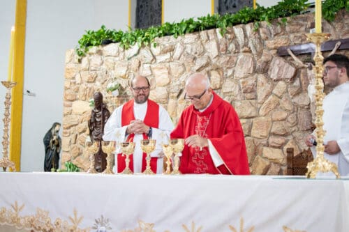 A celebração foi presidida por Dom Luiz Gonzaga Fechio, bispo diocesano, e concelebrada pelo pároco local, Padre Charles Peron. Na ocasião, 47 crismandos, entre jovens e adultos, receberam o Sacramento da Confirmação, fortalecendo seu compromisso com a vida cristã e com a missão na Igreja.