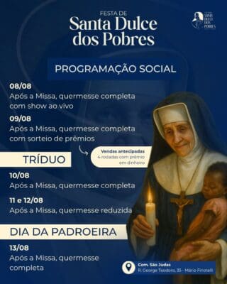 No próximo dia 8 de agosto, a Paróquia Santa Dulce dos Pobres, da cidade de Jaguariúna, dará início à programação festiva em honra à sua padroeira. As celebrações seguem até o dia 13 de agosto, quarta-feira, data dedicada à santa.