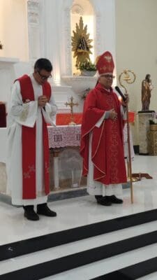 A Santa Missa foi presidida por Dom Luiz Gonzaga Fechio, bispo diocesano, e concelebrada pelo pároco local, Padre Alexandre Pereira. Em sua homilia, Dom Luiz dirigiu uma breve mensagem de paz e fraternidade a todos os presentes, destacando a importância do compromisso cristão assumido pelos crismandos e comunicantes.