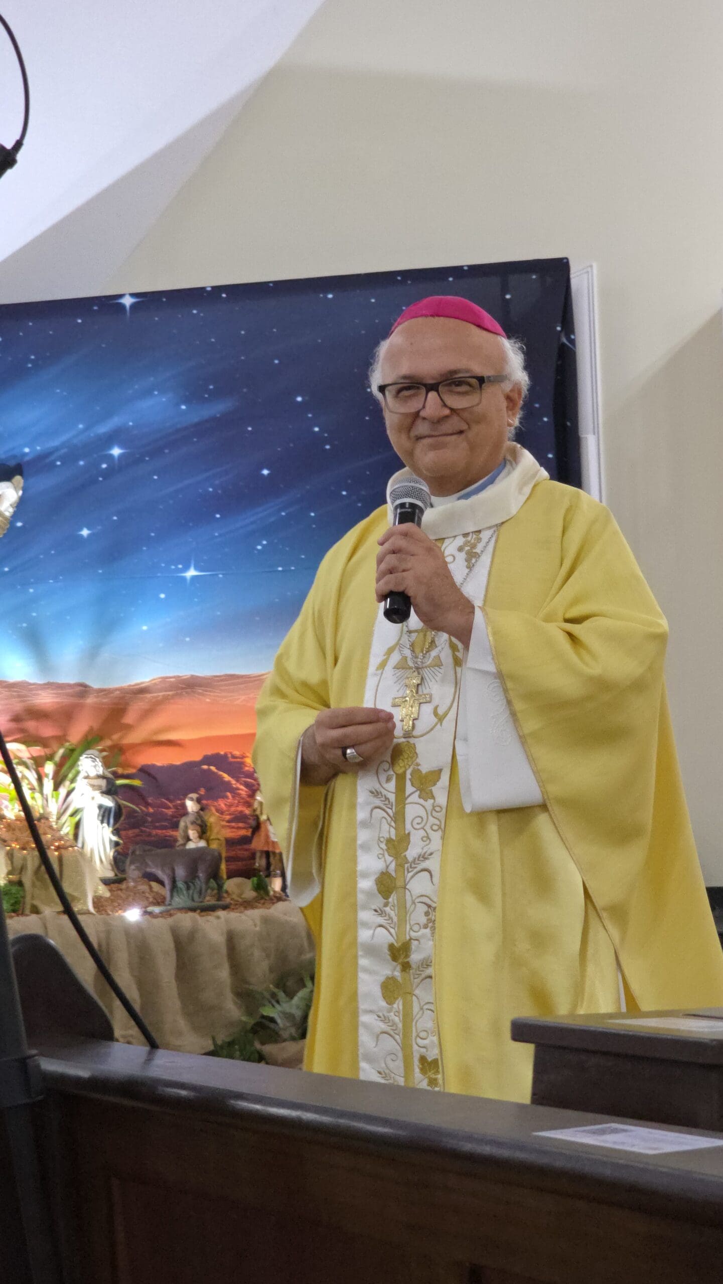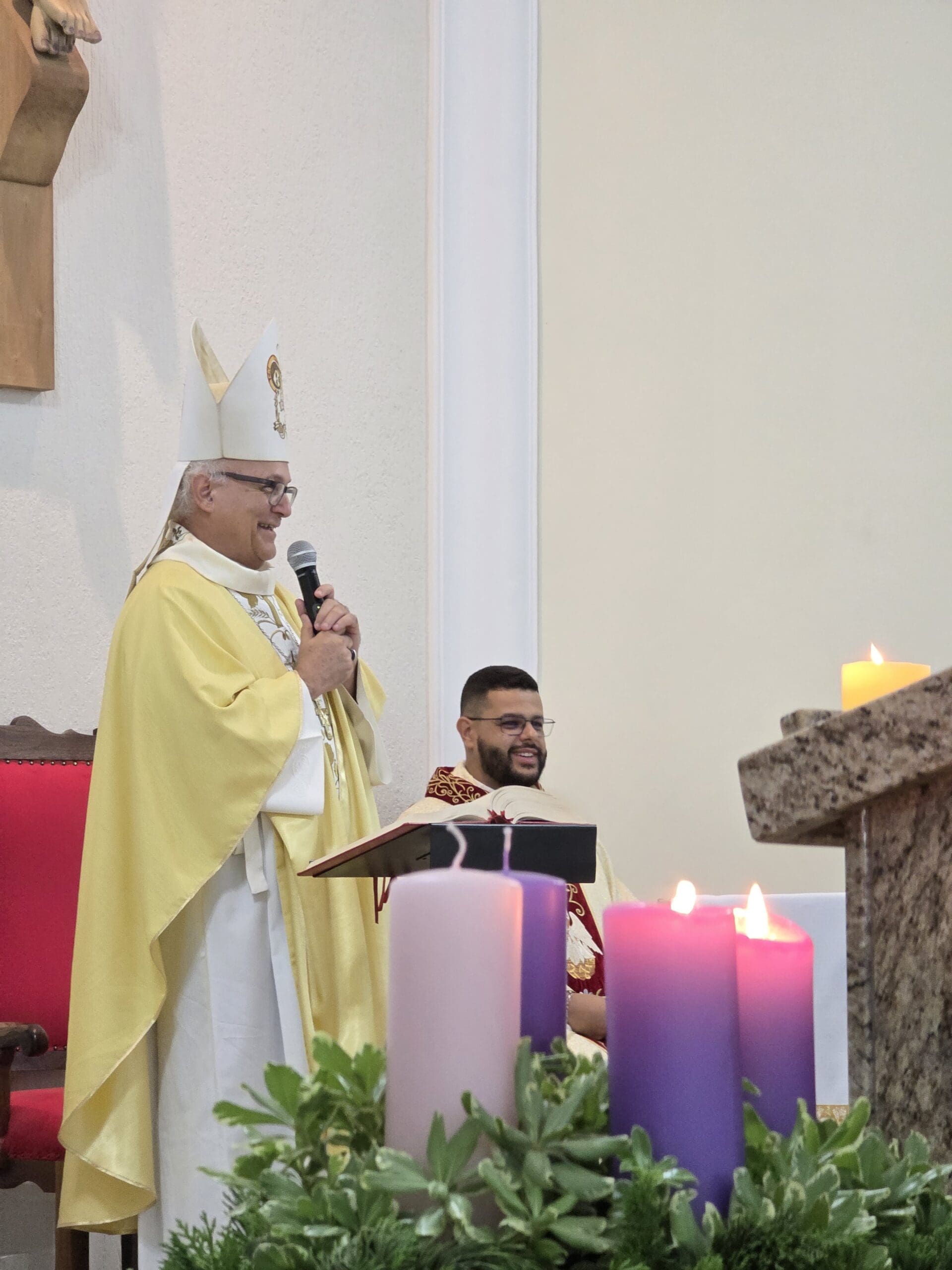 Inspirado no Evangelho de Mt 18,12-14 e no Salmo que proclama “Olhai e vede: o nosso Deus vem com poder”, Dom Luiz convidou a comunidade a viver o Advento com profundidade e esperança. Em sua reflexão, destacou a missão de preparar os caminhos do Senhor, à semelhança de João Batista, recordando que este chamado é dirigido a toda a Igreja e, de modo especial, ao novo pároco. O bispo ressaltou ainda que o verdadeiro poder de Deus não se manifesta pela força, mas pela ternura, afirmando que “esse Deus que tudo pode mostra seu poder no colo, segurando os cordeirinhos”.