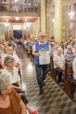 Durante o rito, representantes das pastorais, movimentos e conselhos paroquiais foram convidados a saudar o novo pároco, simbolizando a acolhida fraterna da comunidade.