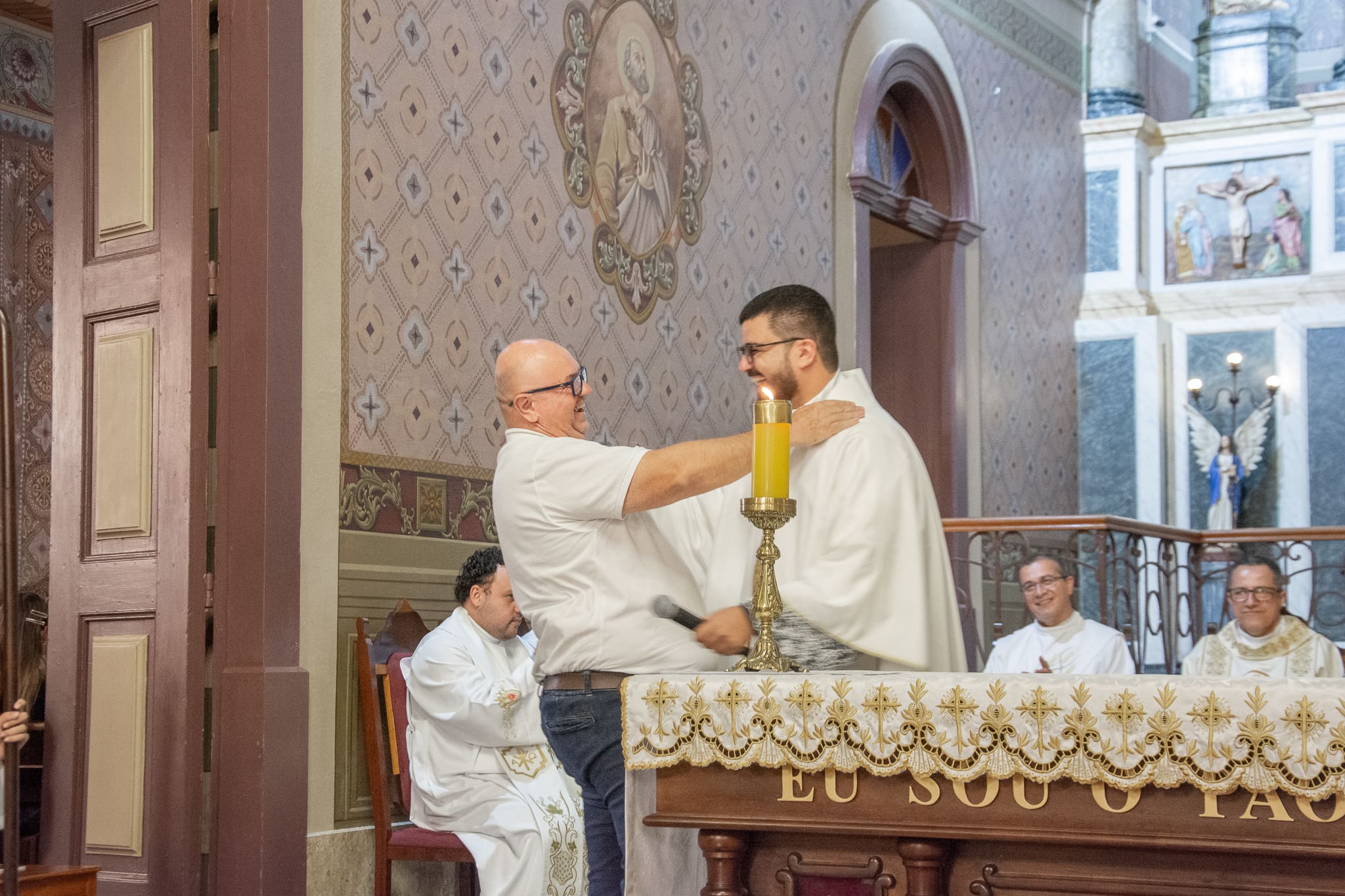 Foram entregues também outros símbolos próprios do ministério, como o Livro dos Evangelhos, a estola e a pia batismal, que representam o anúncio da Palavra, o serviço sacramental e o compromisso com a vida nova dos filhos de Deus.