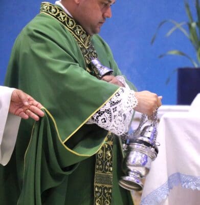 A Eucaristia contou com a concelebração do Padre Ademir Bernardelli, pároco local, e com a participação do Diácono Ademir Marcelo Ferrarin, da Paróquia Nossa Senhora Aparecida, de Arcadas.