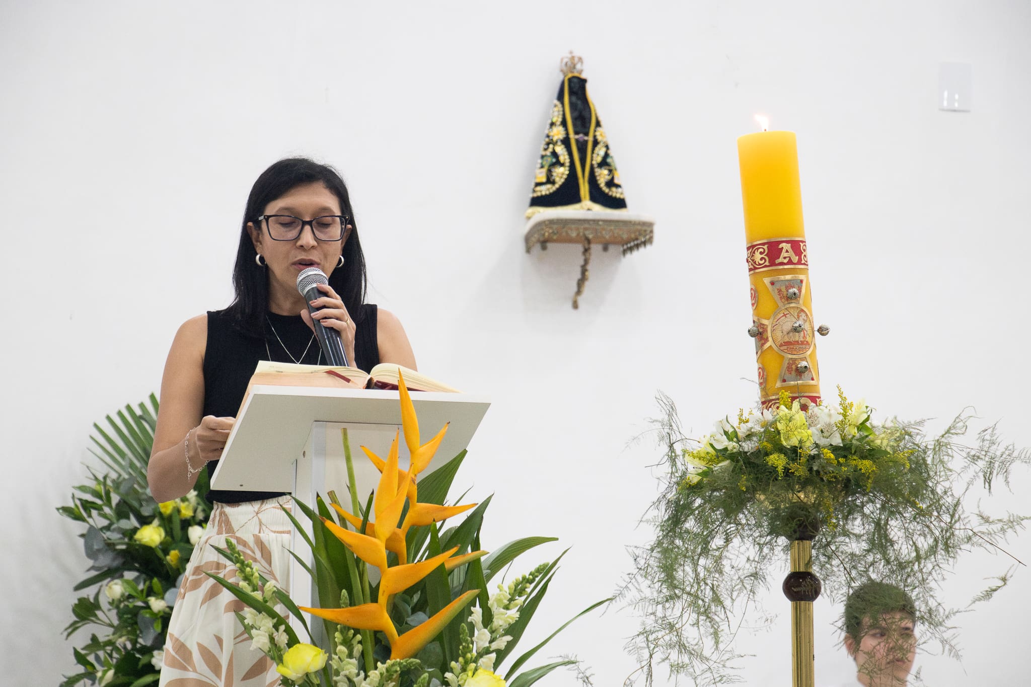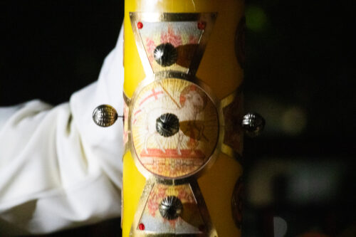 Entre os sinais mais marcantes está o Círio Pascal, marcado com a cruz, as letras Alfa e Ômega — indicando Cristo como princípio e fim — e os cinco cravos que recordam suas chagas gloriosas.