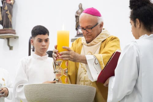 Liturgia Batismal – Momento em que os fiéis renovam suas promessas batismais, reafirmando a fé por meio do “renuncio” e do “creio”, participando da morte e ressurreição de Cristo.